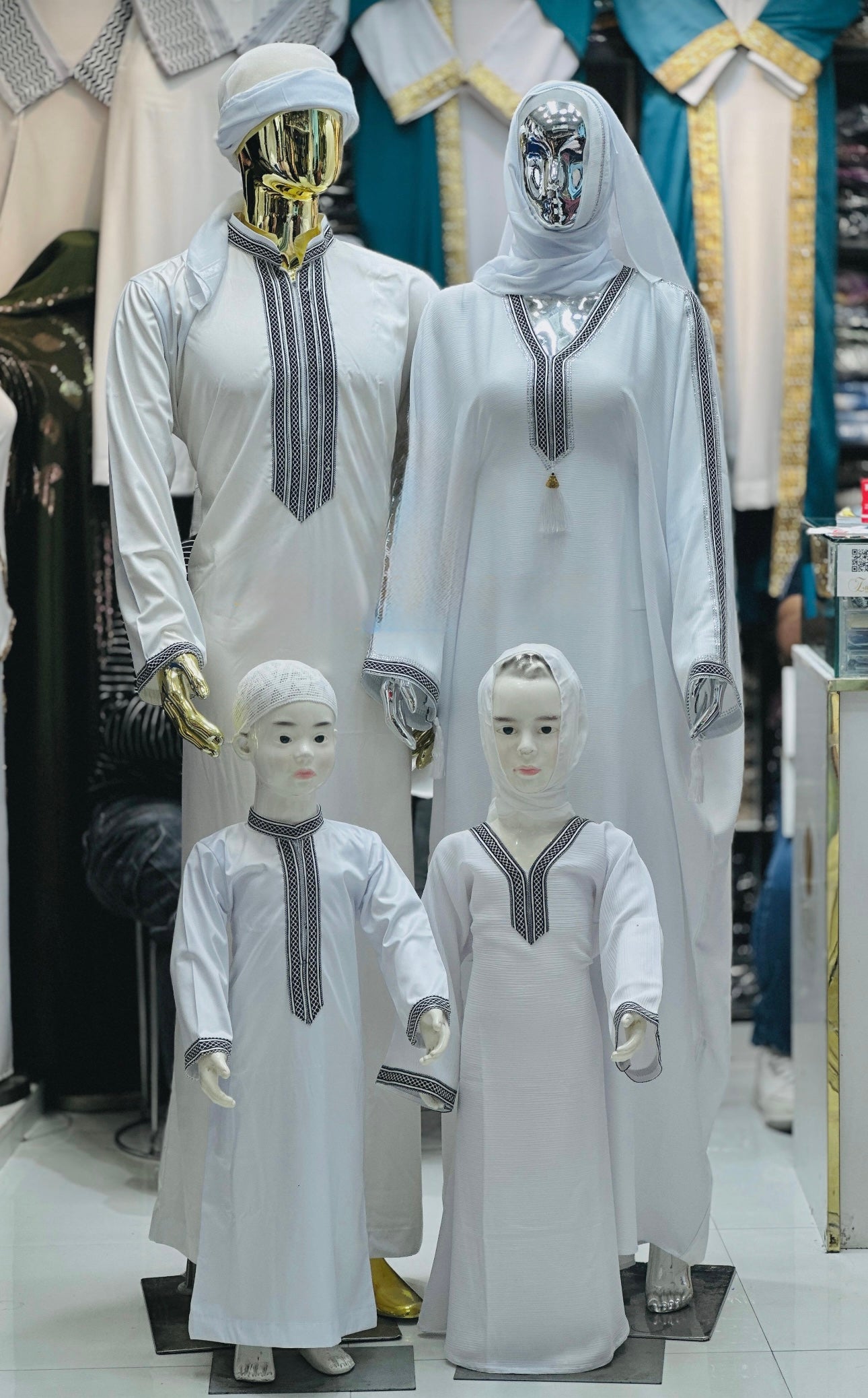 Presenting the Hoob Family Fusion Set: a seamless blend of tradition and modern elegance. This cohesive set features matching white thobes adorned with intricate black embroidery, tailored for men, women, and children. Made from premium fabric, these outfits ensure comfort and sophistication. Celebrate family unity and style at any special event with the Hoob Family Fusion Set.