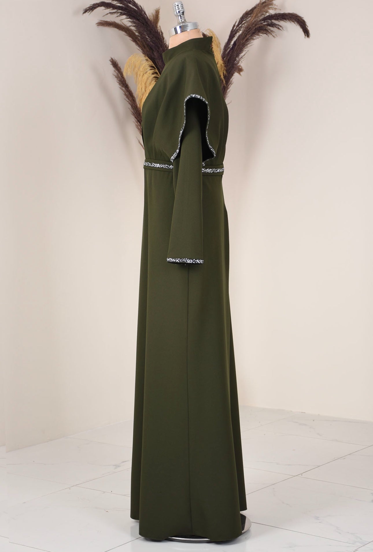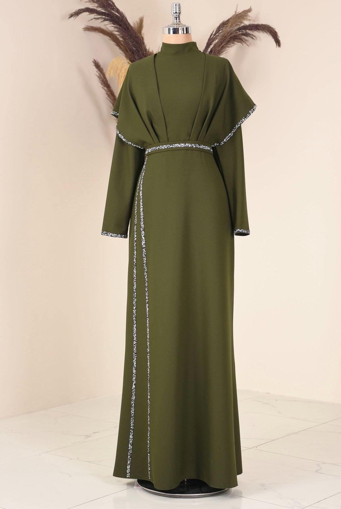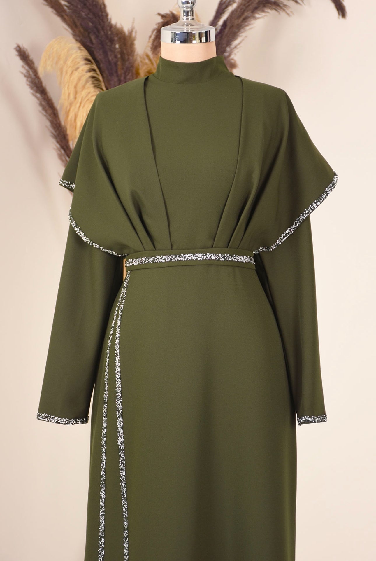 It is an evening dress with stone embroidery on the front, a hidden zipper at the back and lining on the inside. Product size is maxi size. Made from high quality suzanna crepe fabric. Also comes with a matching hijab.