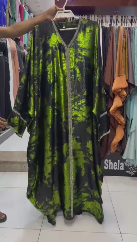 Turn heads with the captivating Shayma abaya, a stunning blend of traditional elegance and modern flair. Its eye-catching neon green and black crinkle-textured fabric ensures you make a bold statement.